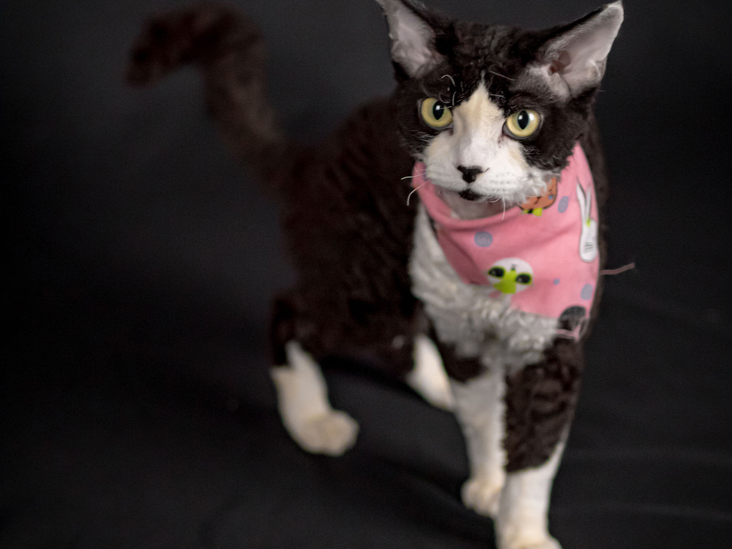 เจ้าแมวหนุ่ม "ข้าวก่ำ" สายพันธุ์ Devon Rex มีขนสีดำและขาว ตัดกันอย่างลงตัว เพิ่มความโดดเด่นและเสน่ห์เฉพาะตัวไม่เหมือนใคร